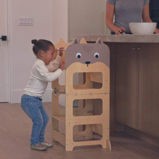 - Will the Toddler Tower fit under my kitchen counter? Yes. The base measures 16.3 inches wide by 15.3 inches deep, compact enough to tuck into most standard kitchen footprints.